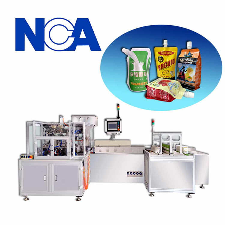 1. The machine is used to weld a plastic spout to a flexible pouch.